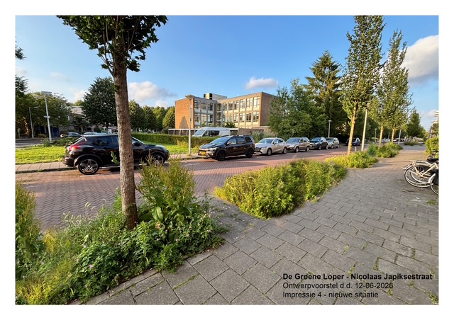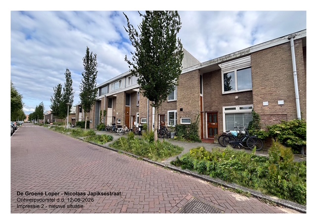 Het idee is om de al rijkelijk begroeide boomspiegels maximaal te vergoten, rekening houdend met doorgangen naar de straat, lantaarnpalen en ondergrondse leidingen. Onder de naam Japikse Groener is het ontwerp voorgelegd aan de gemeente en die reageerden zeer enthousiast.